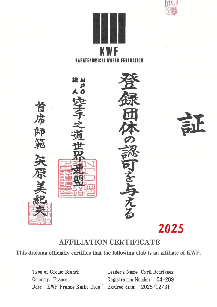 Tous les pratiquants sont licenciés et assurés à la Fédération Française de Karaté, avec un accès de référencement au Japon via la Karatenomichi World Federation,
